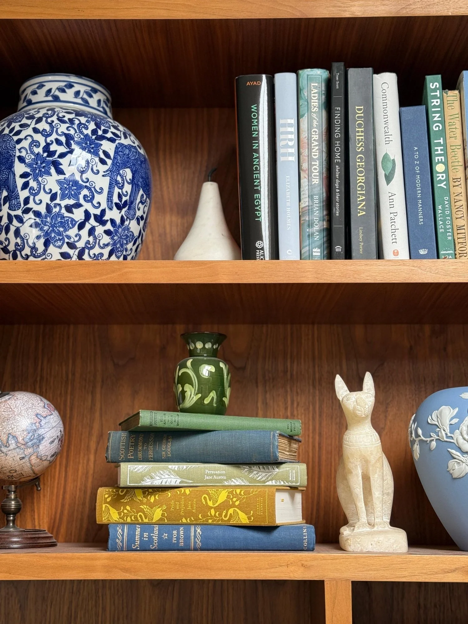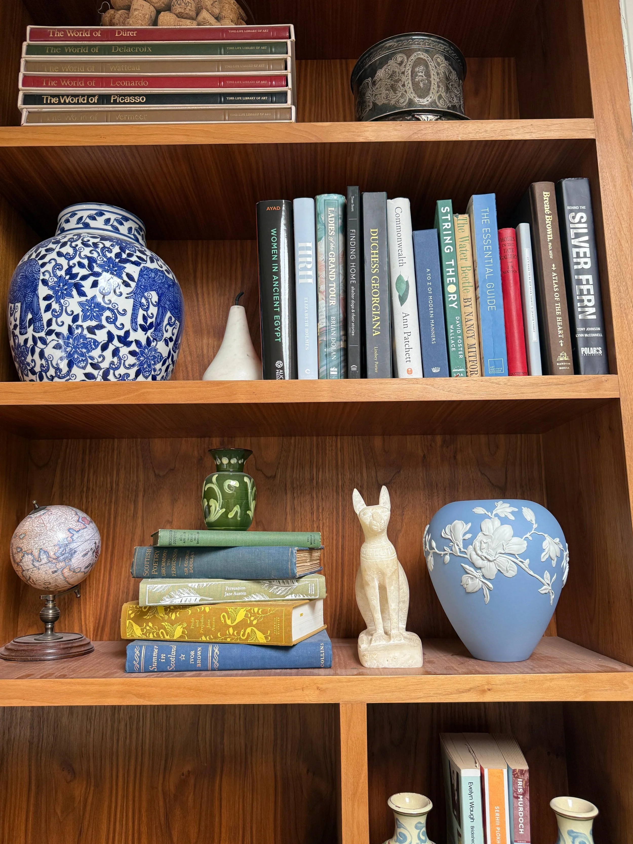 While technically not a ceramic, on the bottom row is an antique Alabaster sphinx from Egypt that I got on a trip there with Andrew. The sphinx represents health and protection, so it felt like a good omen to keep in our home.