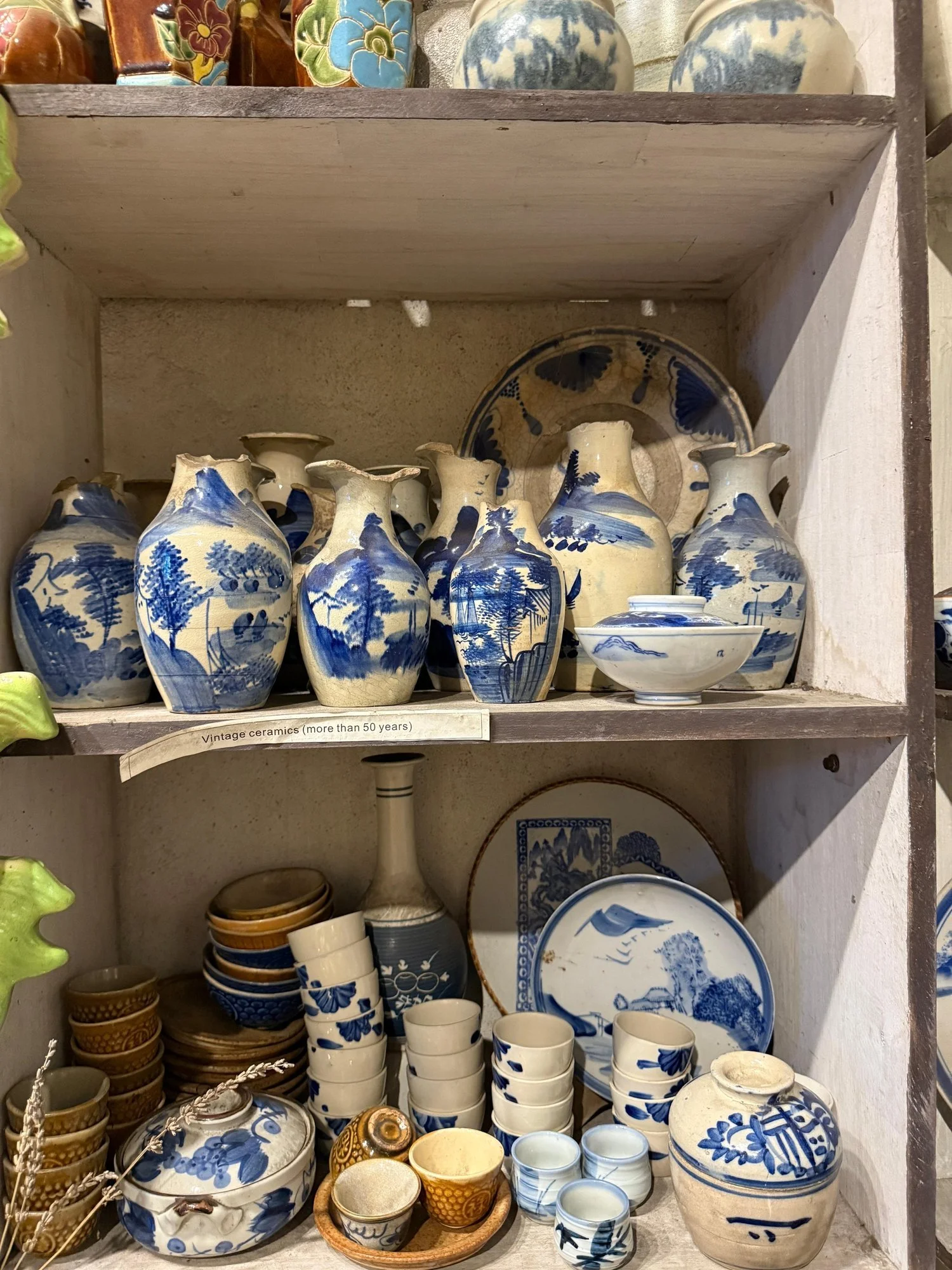 During a trip to Vietnam, I picked up two small antique bowls from the Ming Dynasty, and they have so much character! A true antique, they have a few chips, but that makes them even more charming as these have been well-loved. They’re full of life and history. I also picked up a vase on that same trip. You can see the wide selection of vases, cups, bowls, and platters from the shop below.