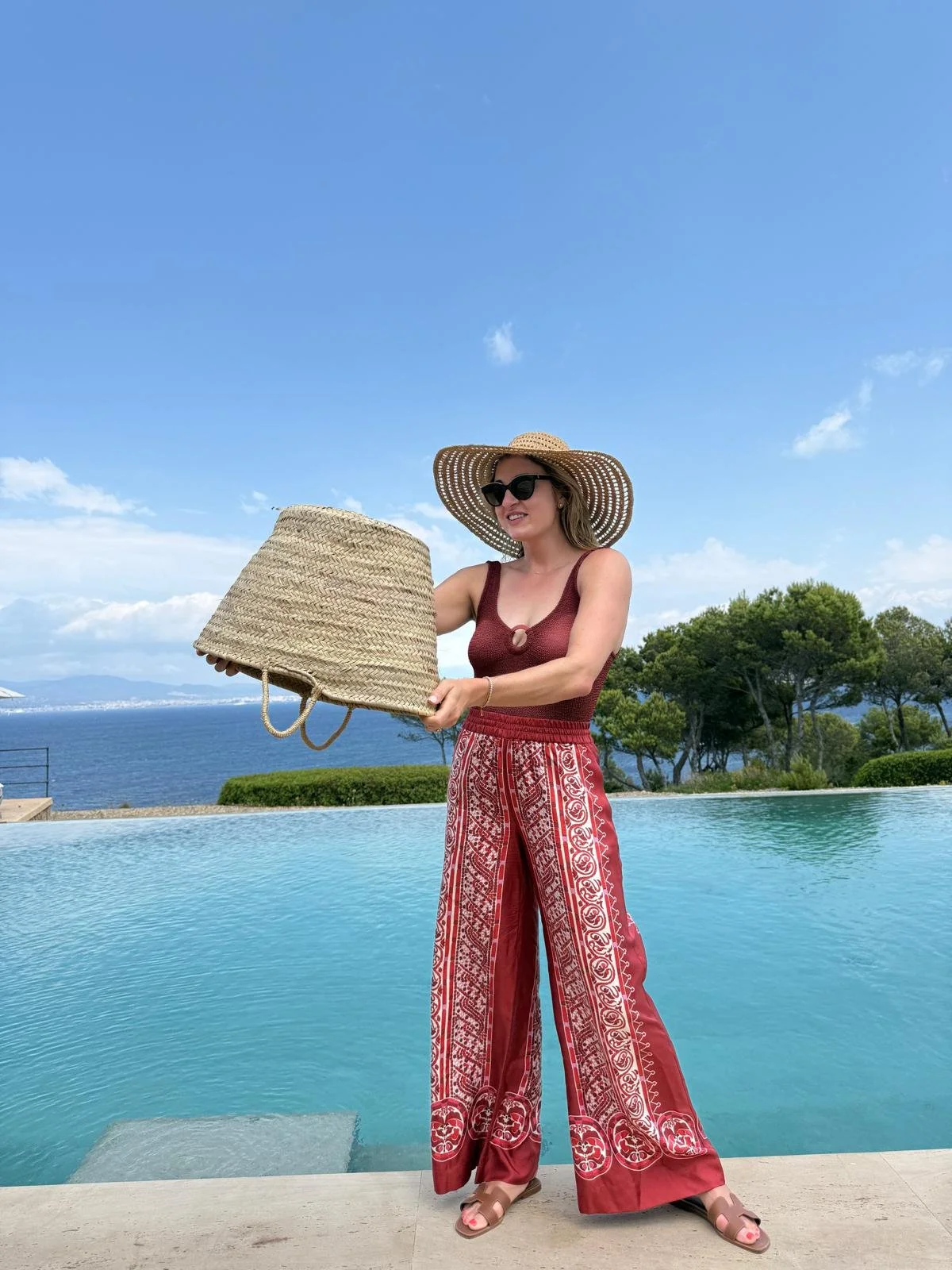 Don't forget accessories that offer both style and practicality. I packed flat sandals for site visits during the day and my favorite Soludos wedge for evenings. A woven market bag adds a touch of local flair while being functional enough to carry your daily essentials. For pool days, I picked up a new swimsuit by Hunza G and a pair of palazzo pants as a cover-up that pulls the whole outfit togther. A wide-brimmed hat not only adds to your aesthetic but is crucial for sun protection, and no summer suitcase is complete without a high-SPF sunscreen. The Spanish sun is strong, and staying protected will keep you feeling good throughout your trip.