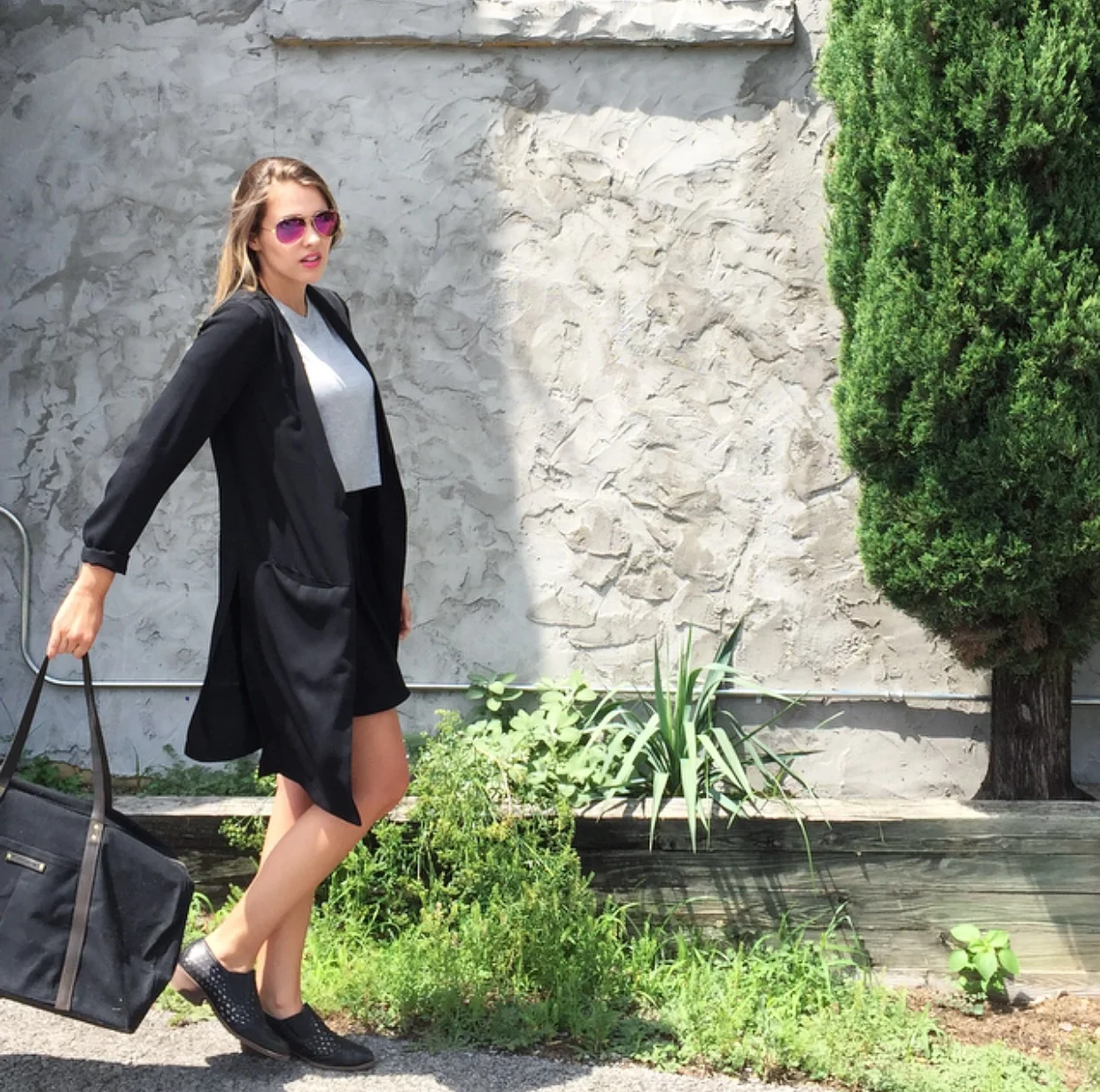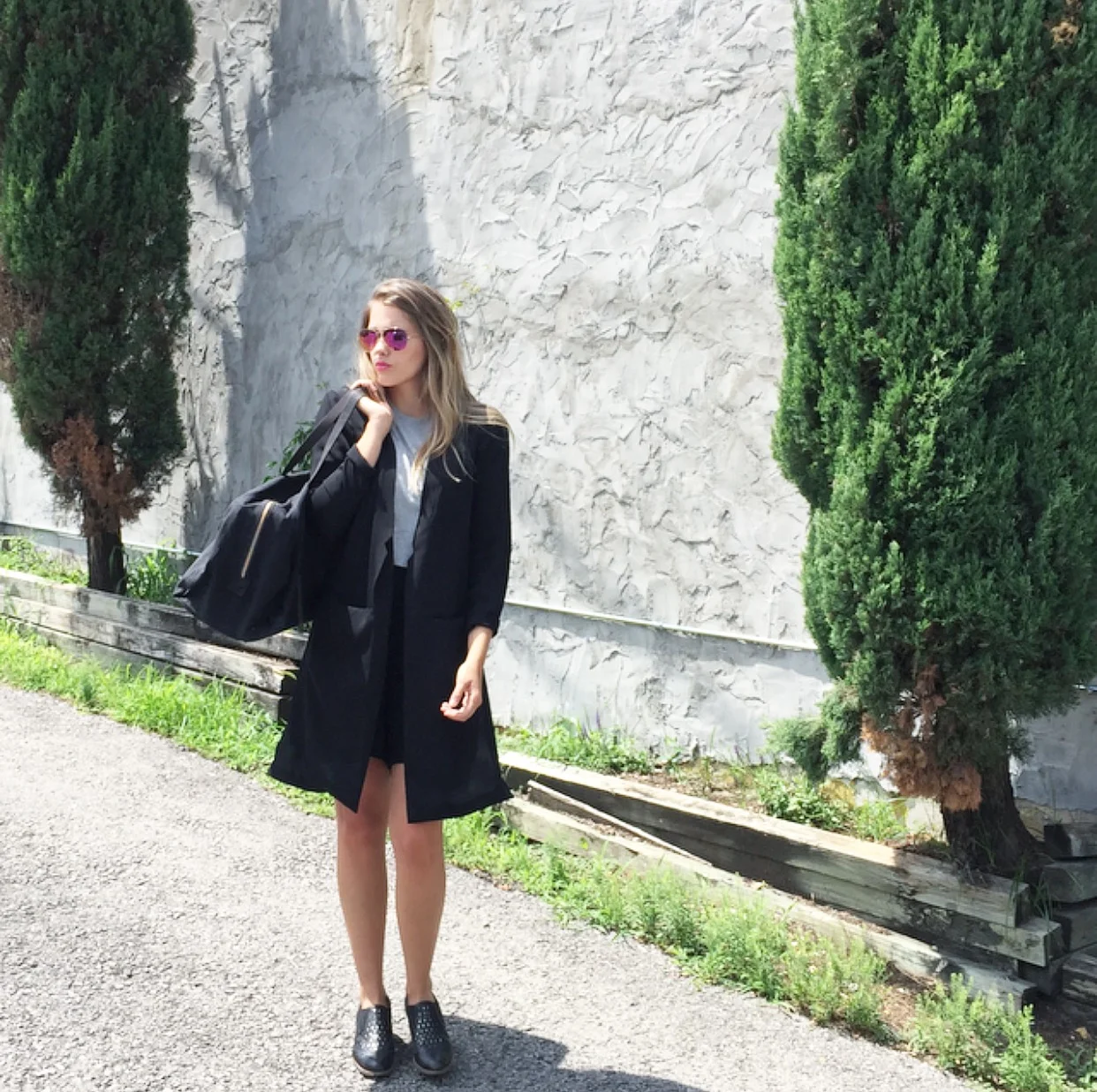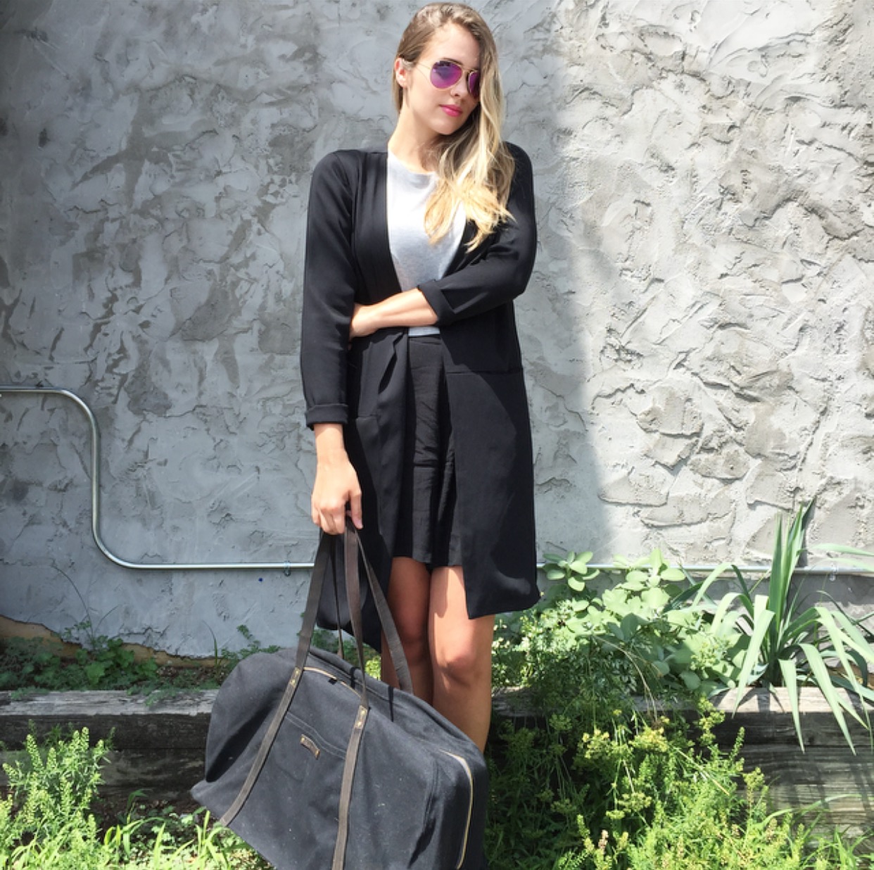 We chose to shoot by some Italian cypress trees and really imagined the setting as if we were in Tuscany. We styled Jenna carefully in Italian frames by "Red's" with polarized lenses as the young Italians often wear. The black bag is Peg & Awl waxed canvas weekender. Black blazer/ Urban Outfitters, high waisted shorts / Anthropologie, top / H&M.