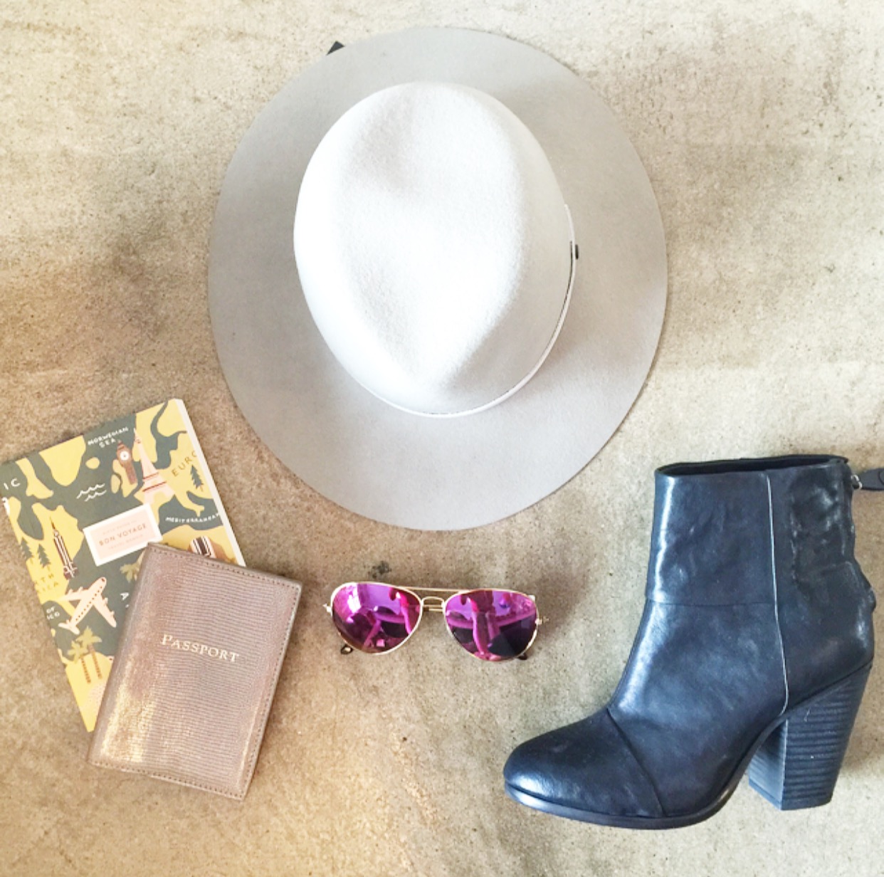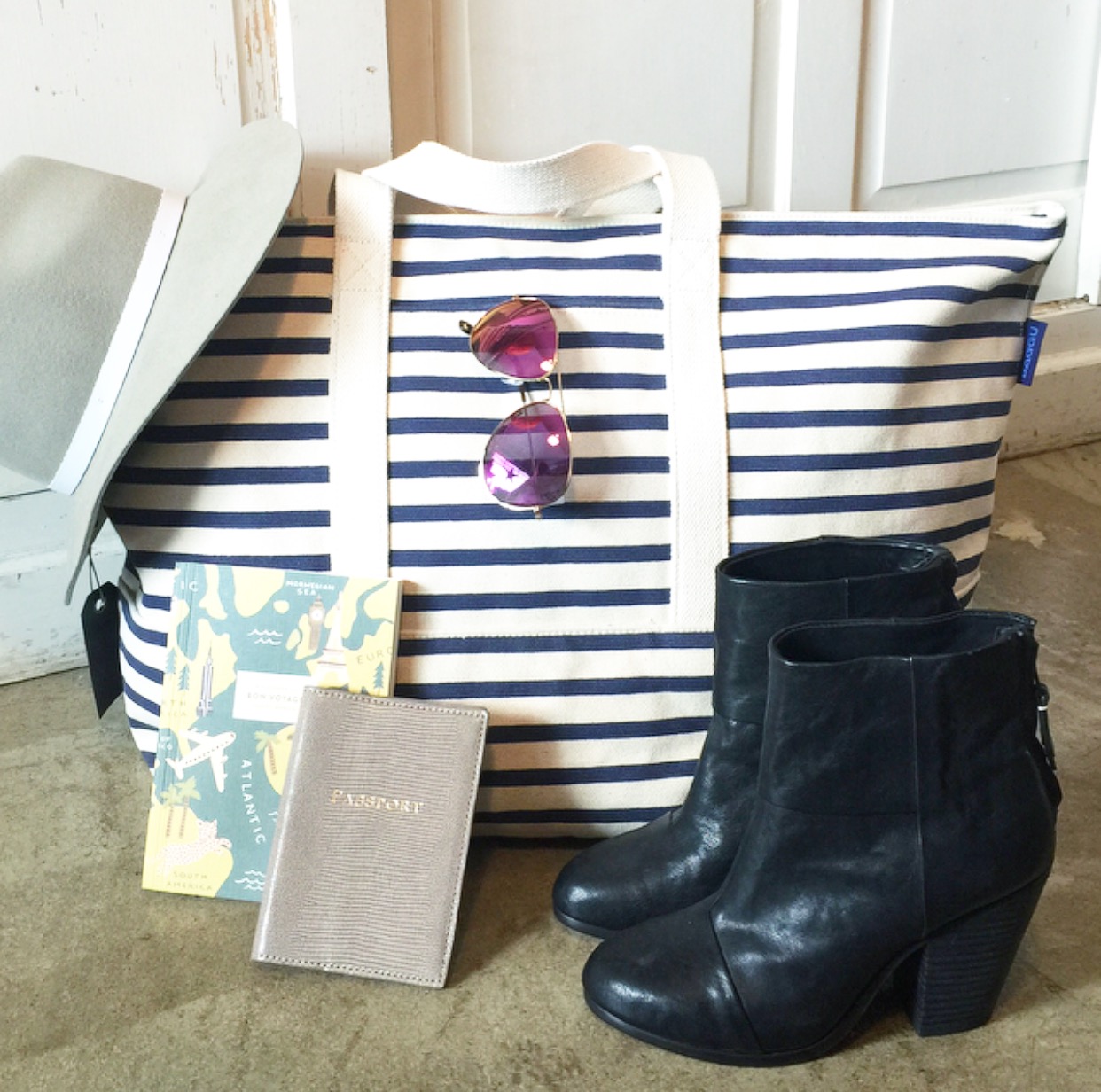 We shot some "trip packables" including Rag & Bone black boots, blue & white striped Baggu tote, Rag & Bone floppy brim fedora, Rifle Paper travel journal, and Graphic Image passport cover. (Courtesy of White's Mercantile.)