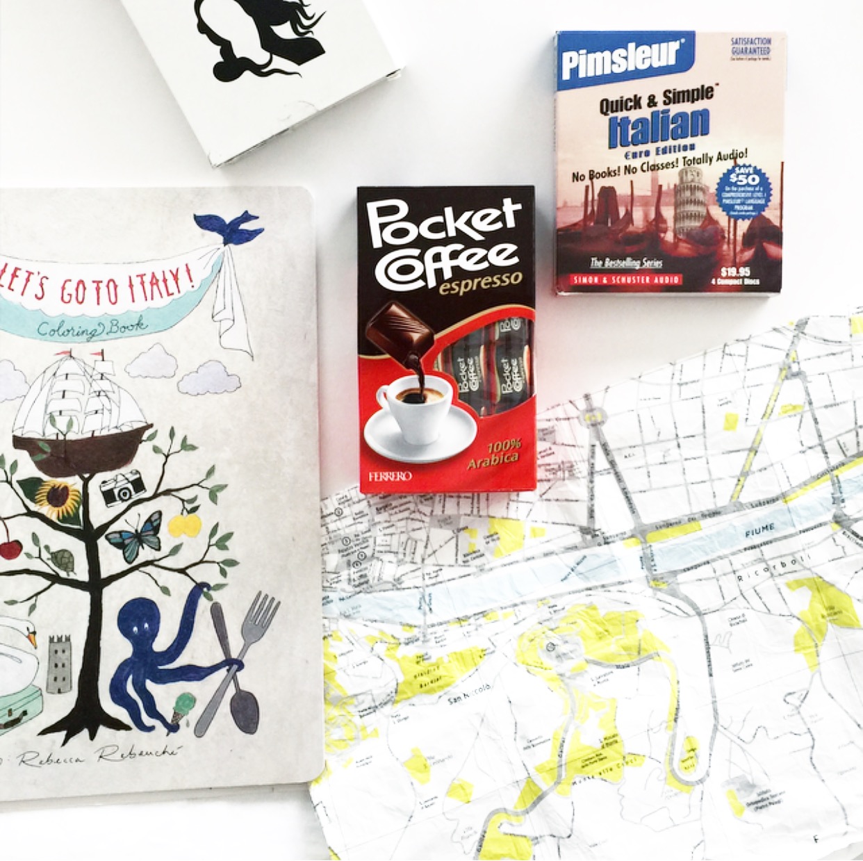 Also in "trip packables" is Pimsleur's Italian audio lessons, Rebecca Rebeuché's "Let's Go to Italy" coloring book, Ferrero's "Pocket Coffee" and Crumpled City's map of "Florence."